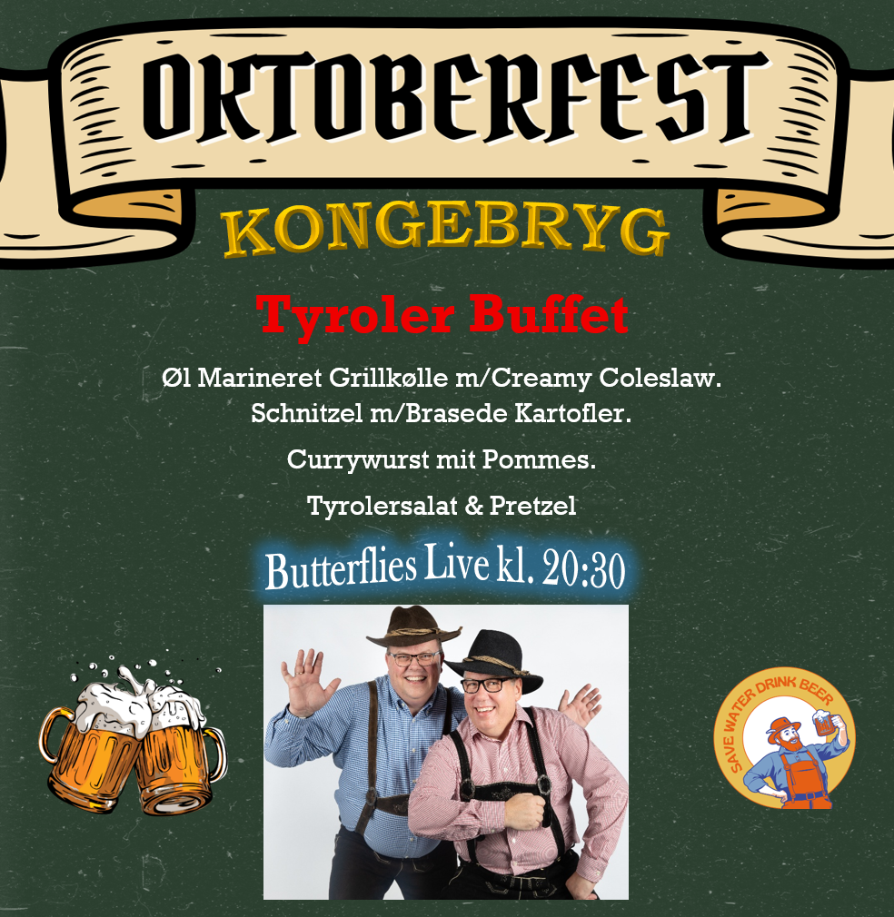 Kabyssen serverer en uimodståelig Tyroler Buffet bestående af: Øl Marineret Grillkølle m/Creamy Coleslaw – Schnitzel m/Brasede Kartofler – Currywurst mit Pommes – Tyrolersalat – Pretzel.