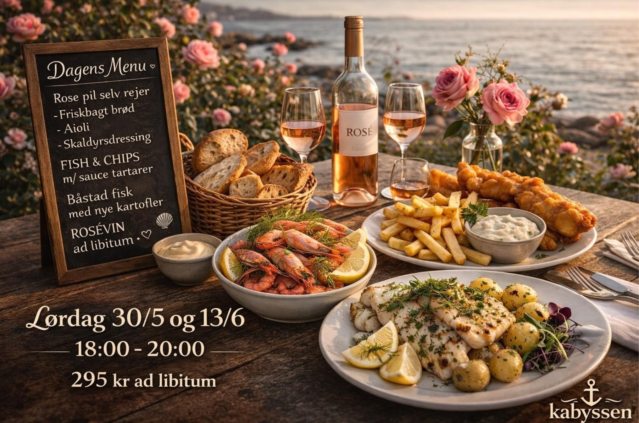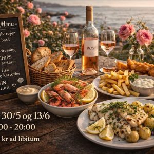 Glæd dig til en aften på Kongebryg med Pil Selv Rejer, Friskbagt Brød, Aioli, Skaldyrs Dressing. Herudover FISH AND CHIPS m/ sauce tatarer, Båstads fisk med nye kartofler og ikke mindst kølig rosé Alt er ad libitum